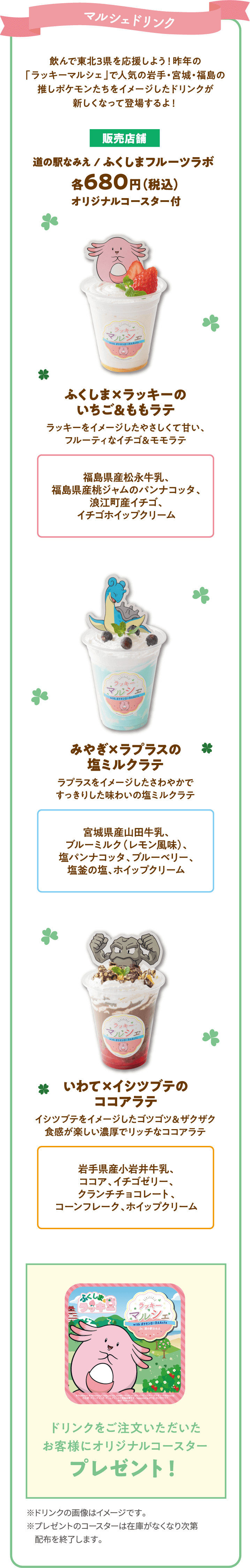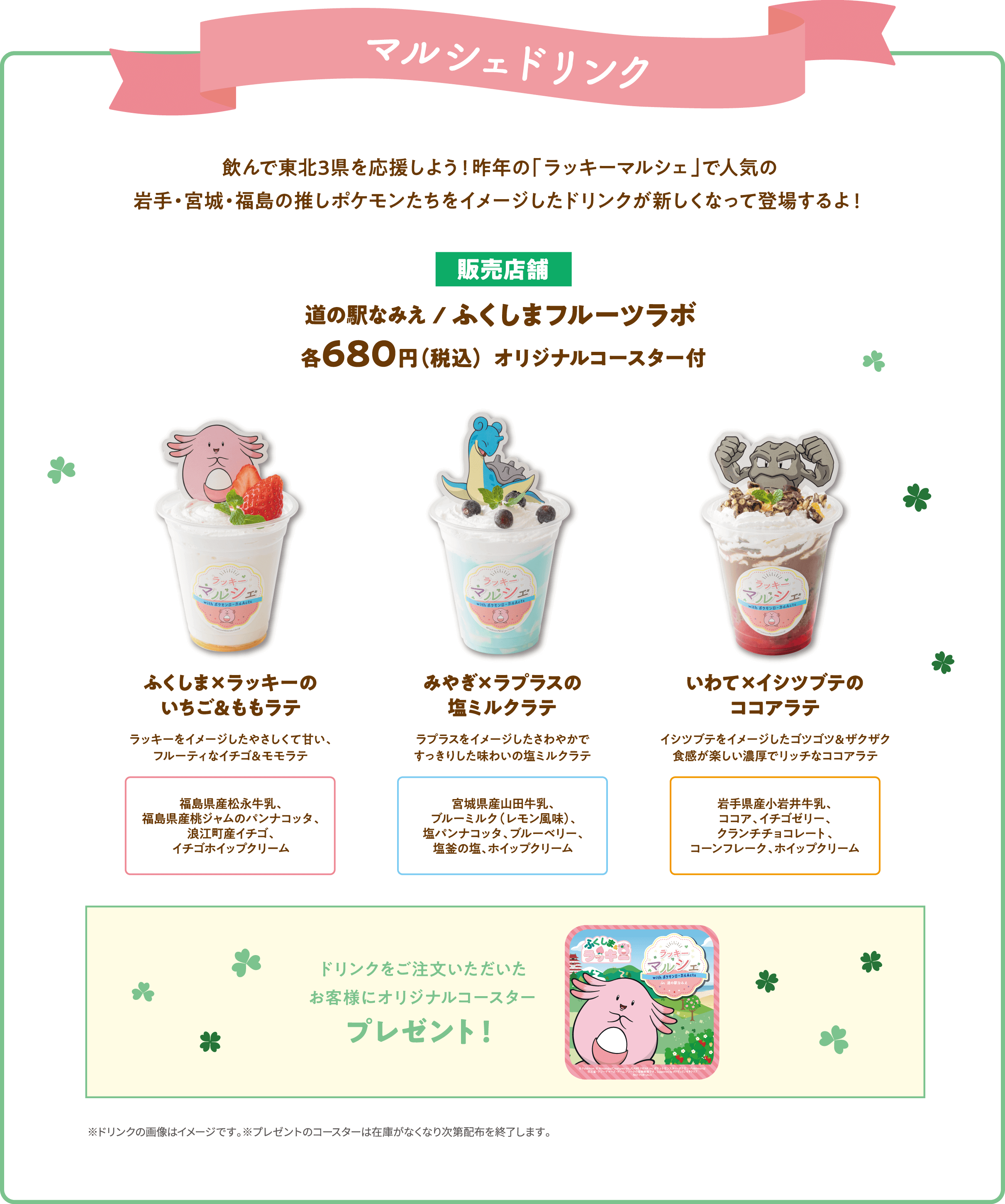 飲んで東北3県を応援しよう!昨年の「ラッキーマルシェ」で人気の岩手・宮城・福島の推しポケモンたちをイメージしたドリンクが新しくなって登場するよ!