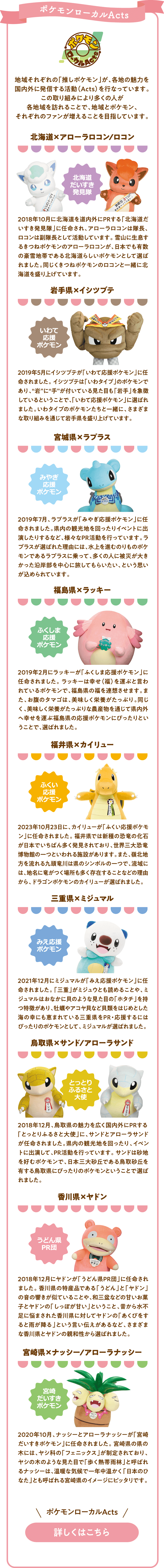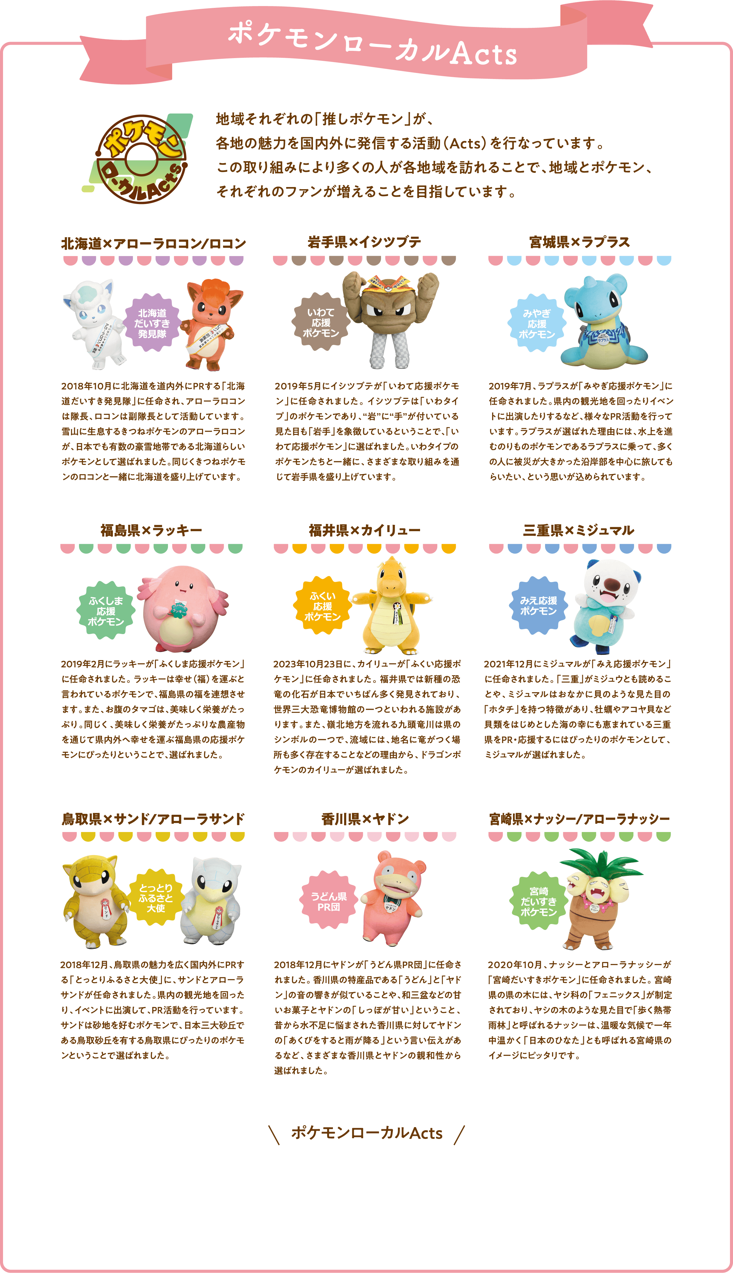 地域それぞれの「推しポケモン」が、各地の魅力を国内外に発信する活動(Acts)を行なっています。この取り組みにより多くの人が各地域を訪れることで、地域とポケモン、それぞれのファンが増えることを目指しています。